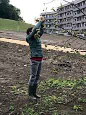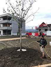 Ein Herbsttag Ende September, die Bewohner*innen des Generationenhauses tragen Gummistiefel und stehen gespannt auf ihrer Terrasse: Heute dürfen sie – unter fachkundiger Anleitung von Oliver Bütikofer, Landschaftsarchitekt bei Hager Partner, sowie dem Gartenbauer der Firma Herrmann – einen Baum neben ihrer Terrasse pflanzen.